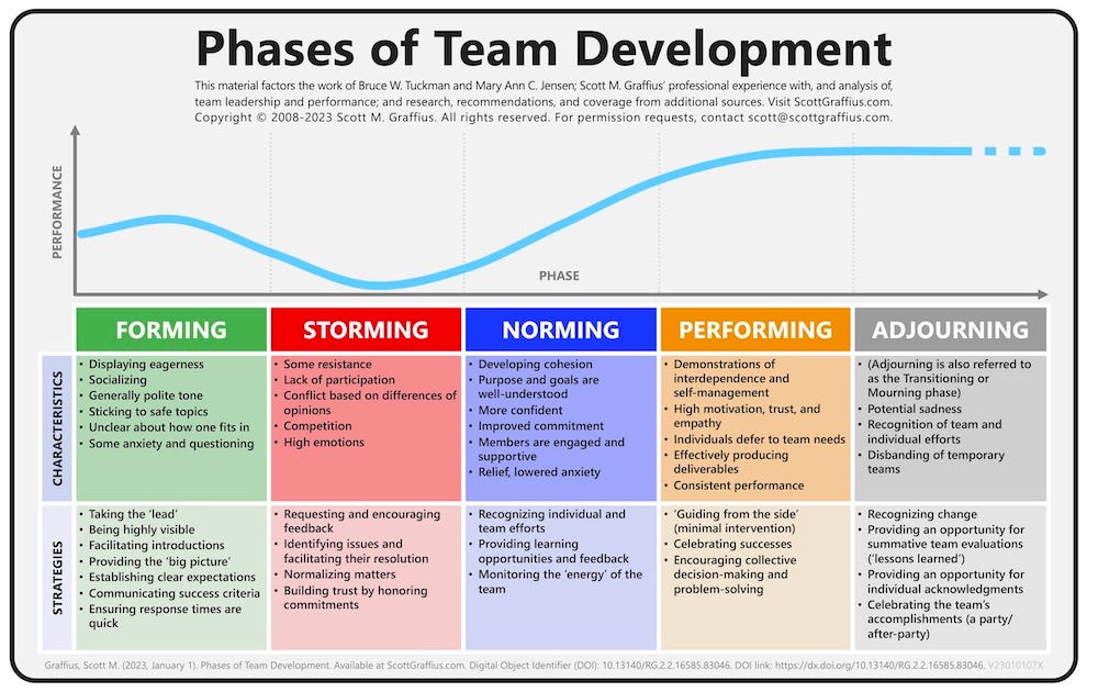 The performance of the team during all of these phases differs. While a new team can show immediate effective performance during the forming phase, that same performance shows a big drop when entering the storming phase. Often, due to the conflict, team members have less attention for the overall result. After the storming phase, the performance rises steadily again to reach its peak or plateau in the performing phase. Remarkable to see is the plateau the team reaches is higher than what the team could achieve when newly formed. Storming as a team is not always easy, but the benefits you obtain from doing that sets the team up for future success.
